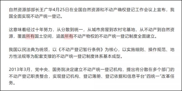 昨天下班回家路上各位有没有刷到一张图?一张来自国社的图,后面跟着紧凑的四小段话,大致意思是十年了,从城市房屋到农村宅基地、从不动产到自然资源的所有国土空间,我们终于实现了不动产统一登记。