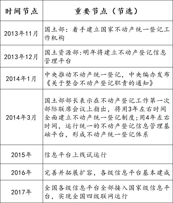 比如2014年国土部负责人表示,要用3年左右时间全面建立不动产统一登记,要用4年左右时间,运行统一的不动产登记信息管理基础平台。