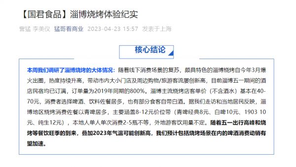 其中,国泰君安食品饮料团队“赴淄赶烤”后,火速发布研报《淄博烧烤体验纪实》,引起业内广泛热议。