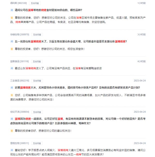 实际上,除了金针菇概念股,在交易所互动平台上,还有不少食品类公司也被投资者问及“淄博烧烤”的相关问题。