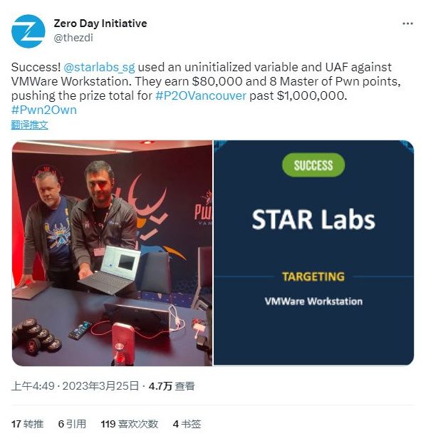 这两个零日漏洞由 STAR Labs 安全团队发现,他们 1 个月前在 Pwn2Own Vancouver 2023 黑客大赛中曾公开演示过。