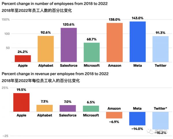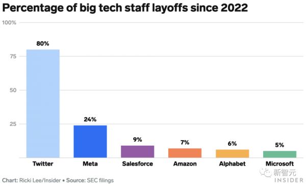 在比例上,裁掉80%员工的推特毫无疑问地占据了第一的位置,而送走近四分之一员工的Meta紧随其后。