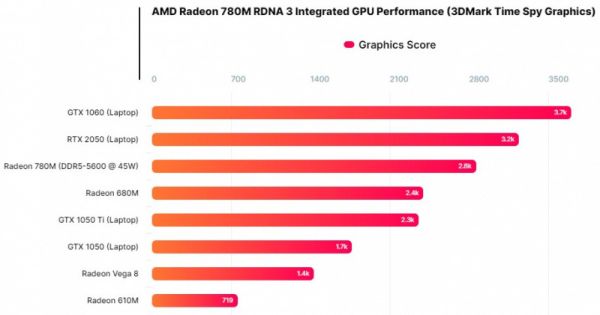 在综合测试中,Radeon 780M 无法赶上移动版 GeForce RTX 1060 和 GeForce RTX 2050,在 3DMark Time Spy 中仅获得 3000 分。在同一测试中,参赛选手的成绩分别约为 370 分和 320 分。