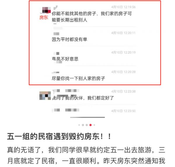来自北京的大一新生兔子酱告诉新周刊记者,3月18日,她以447元每晚的价格和朋友在携程上订下了武汉的一套民宿。但到了4月10日,房东突然以“房子要转为长租”为由,催促她尽快退房。