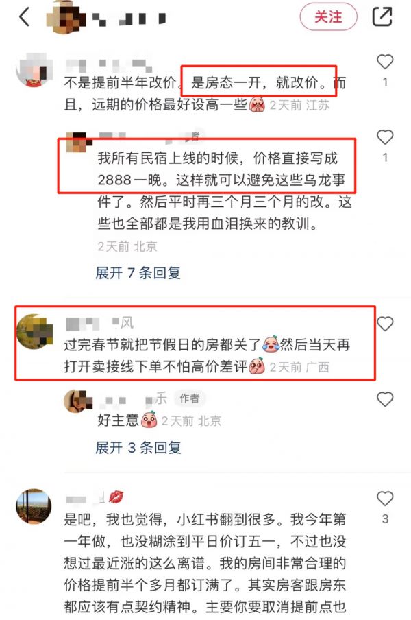 也有从业者表示,“过完春节就把节假日的房源都关闭”“把远期的房源价格定高,然后再慢慢调回正常水平”,这样就会避免被客人低价抢单的状况。