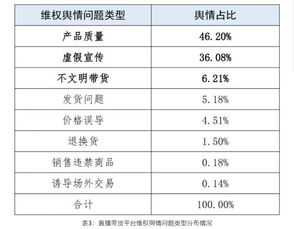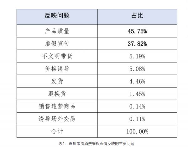 从消费维权类型来看,涉及产品质量问题的占45.75%,虚假宣传的占37.82%,不文明带货的占5.19%,价格误导的占5.08%,发货的占4.46%,退换货的占1.45%,销售违禁商品的占0.14%,诱导场外交易的占0.11%。