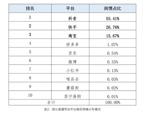 ▍截自北京阳光消费大数据研究院官微《直播带货舆情报告》强调,与2021年的数据相比,抖音舆情占比仍高居第一位;快手占比由10.07%提升到26.76%,超过淘宝排在第二位;淘宝的维权舆情占比较2021年有所下降。