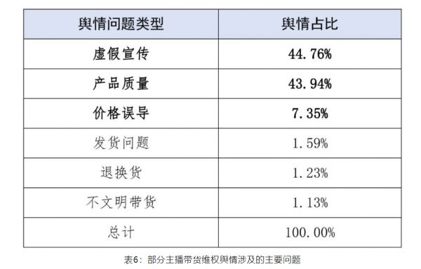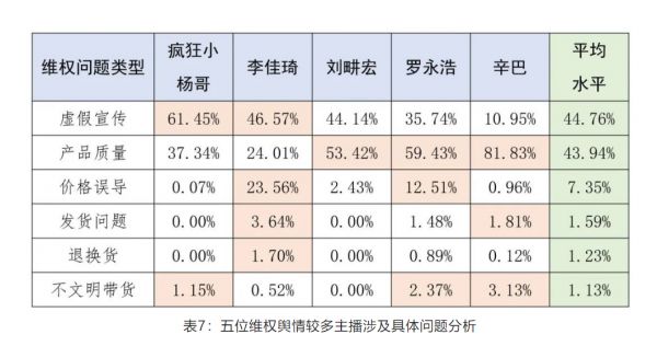 《直播带货舆情报告》还进一步指出,疯狂小杨哥、李佳琦、刘畊宏、罗永浩、辛巴等5位主播的维权舆情占到本次采集主播舆情的90.97%。这5位主播的直播带货维权舆情反映的问题,主要涉及虚假宣传、产品质量、价格误导、发货问题、退换货和不文明带货等方面,而虚假宣传、产品质量和价格误导均占到总体舆情的90%以上。