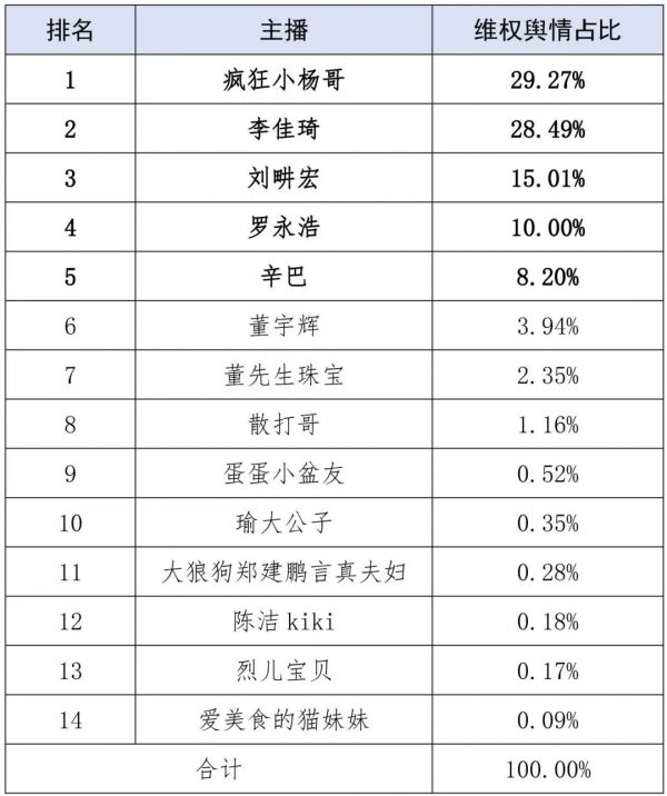 值得一提的是,《直播带货舆情报告》还针对部分主播的直播带货消费维权舆情进行了分析,“疯狂小杨哥”、李佳琦、刘畊宏、罗永浩、辛巴等14位知名头部主播被点名。