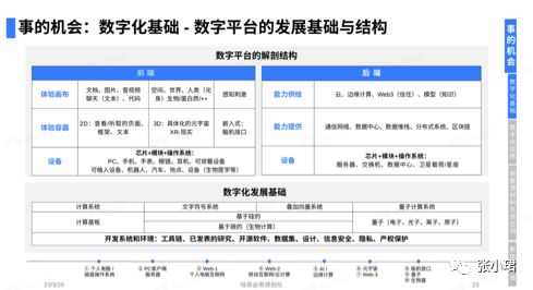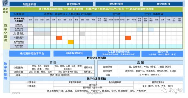 首先,底层是数字化的技术,因为数字化是人的延伸。数字化的基础里有平台,有发展基础,包括开源的代码、开源的设计、开源的数据;平台有前端、后端等。这里有大量机会。