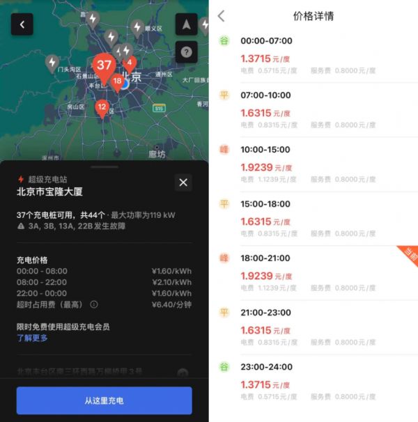深途对比发现,已经开放的特斯拉北京宝隆大厦超充站采用的是波峰波谷分段计价,1.6元~2.1元/kWh,距离很近的一个特来电充电站,价格为1.37元~1.92元/kWh。相比之下特斯拉更贵。