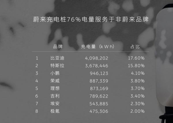一个最直接的佐证是,一些特斯拉车主跑到蔚来充电站去充电。蔚来总裁秦力洪在今年2月表示,蔚来充电桩76%电量服务于非蔚来品牌,其中前两名是比亚迪、特斯拉,特斯拉占到15.8%。