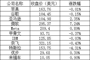 大型科技股涨跌不一,亚马逊、微软和Meta上涨,微软涨幅超过7%。微软周二收盘后公布的第三财季(截至2023年3月31日)财报显示,得益于人工智能对业绩的推动,该财季的利润和营收均超出分析师预期。