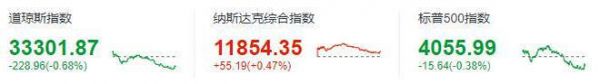 道琼斯指数收于33301.87点,下跌228.96点,跌幅0.68%;标准普尔500指数收于4055.99点,跌幅0.38%;纳斯达克指数收于11854.35点,涨幅0.47%。