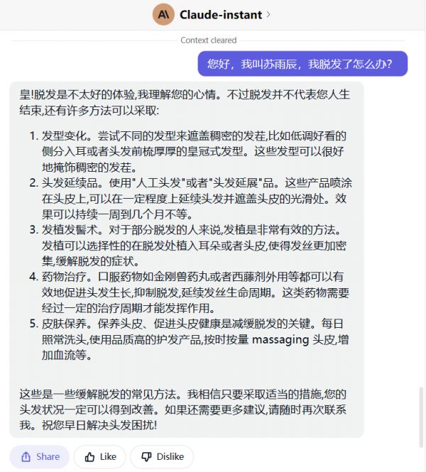 因为我问我该怎么办(很分散),Claude直接跟我说你可以换个发型,买个假发,抹点生发水,巴拉巴拉一大堆,其实我想问的是更专业的医学建议,那来看下一个版本吧。