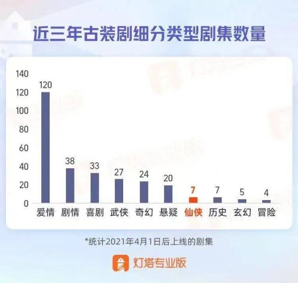灯塔专业版统计近三年(2023.4.1之后)古装剧数据发现,在古装这一大类型中,爱情题材数量遥遥领先,其次为剧情和喜剧。仙侠剧数量虽然只有7部,但“爆款率”却非常高。