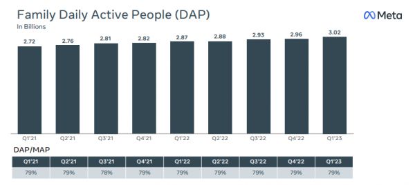 2021年以来Meta社交家族的日活情况,图片来自Meta财报