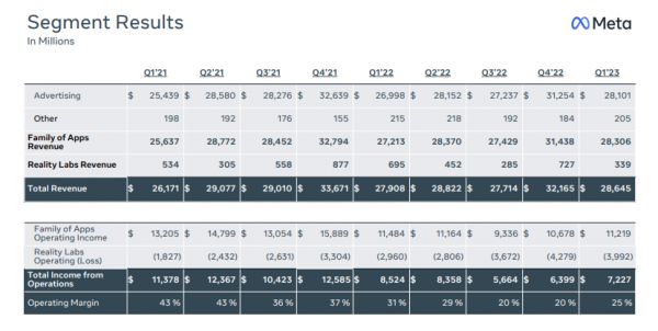 首先,营收、利润终于止跌开始回升。Meta一季度营业收入为286.45亿美元,同比增长3%,远远好于市场预期同比下降超0.8%的预期。而去年三季度和四季度分别下降4%和3%。稀释后每股净收益为2.20美元,虽然同比下降19%,但也远不及同比下降26%的市场预期,在去年四季度同比下降52%的基础上大大回升。