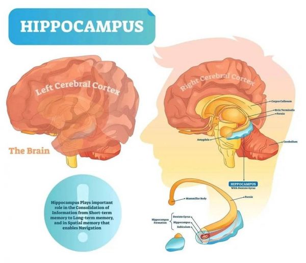 大脑内部的海马体结构,帮助合成不同类型的信息来创造记忆。来自:simplypsychology