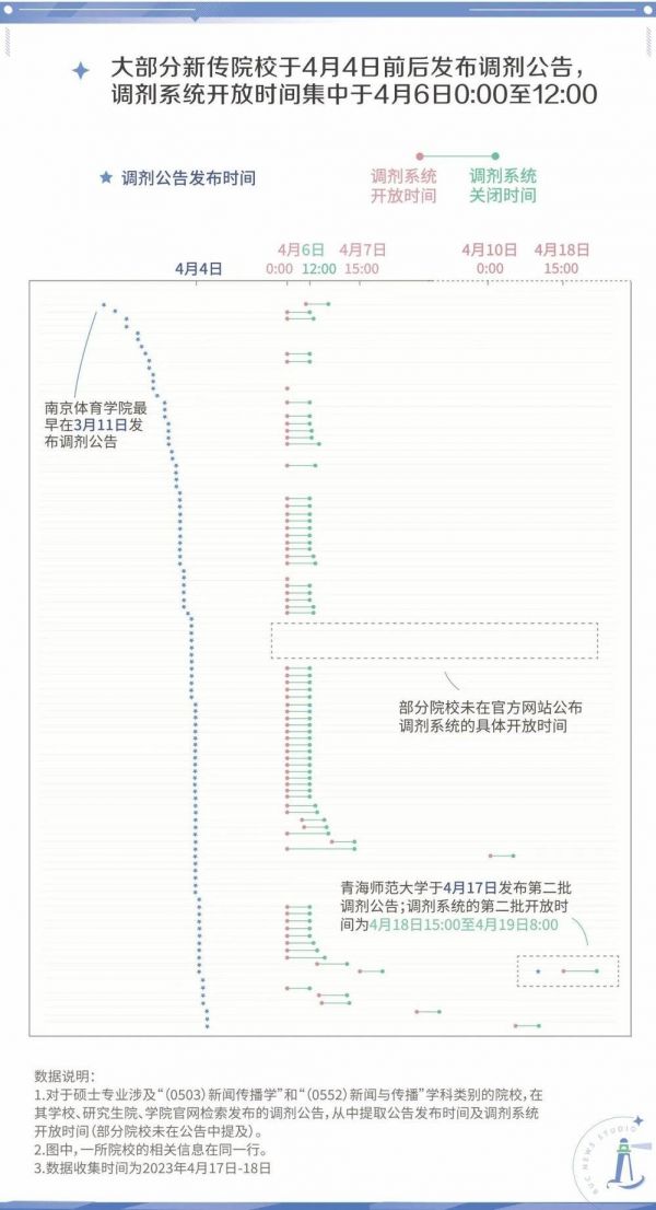 我们发现,2023年考研调剂公告的发布时间主要集中于4月4日前后,而调剂系统则多在4月6日零点开放,倘若此前未进行相关信息的搜集,考生可以用来整理信息的时间就比较紧张。