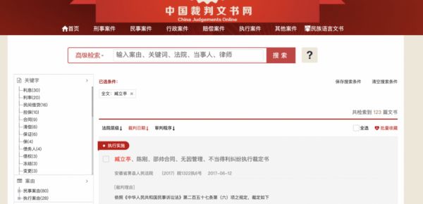 4月24日,时代财经在该网站以“臧立亭”为关键词进行搜索发现,共有123篇法律文书结果,案件全部发生于安徽省,且大部分判决书、裁定书均由安徽省萧县人民法院出具,以下所提案件涉及的臧立亭,均系1970年11月1日出生、家住安徽萧县的“臧立亭”。