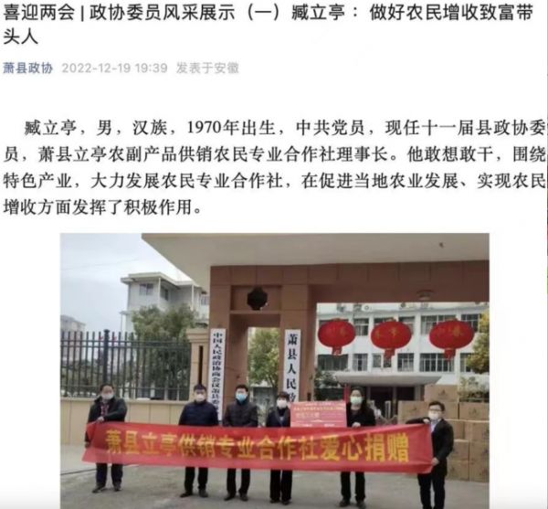 在萧县官方的通报介绍中,萧县立亭合作社是一家农民专业合作社,主要为社员提供农副产品购销等服务。