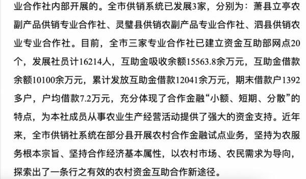 2018年末,宿州市供销社相关新闻稿指出,综合改革实施以来,宿州供销社大胆尝试在合作社内部开展资金互助业务,全市供销系统内已发展3家,萧县立亭农副产品供销专业合作社即为其一。
