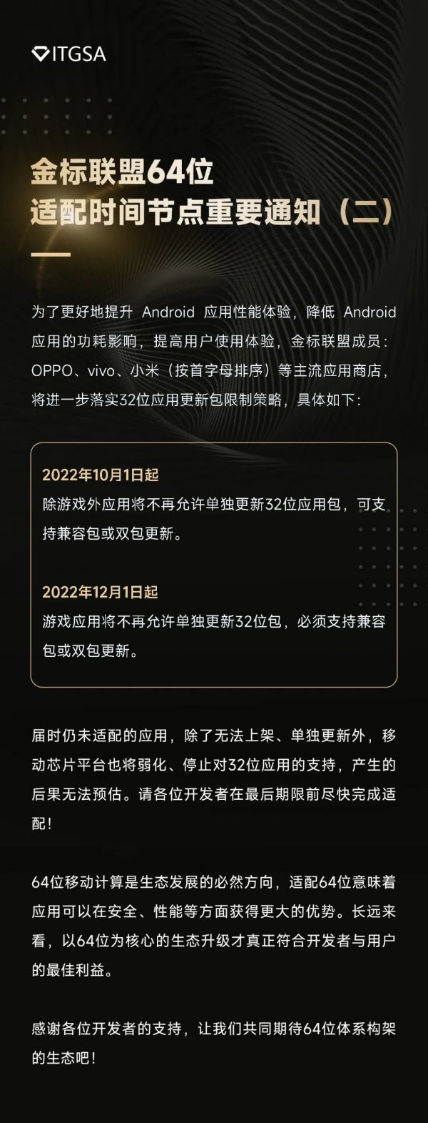 2023 年金标联盟成员将继续落实 2022 年 9 月 14 日发布的“金标联盟 64 位适配时间节点重要通知(二)”并限制仅支持 32 位新应用上架。