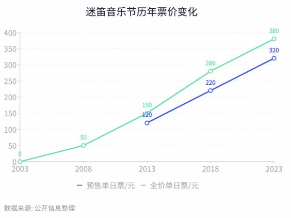 卢晴的体验并不是个例,近20年内音乐节的门票价格确实在飞速上涨。历史最悠久的迷笛音乐节最开始是免费的,后来门票价格不断上涨。根据我们的统计,它现在的票价已经是十年前的2.5倍,五年前的1.4倍。