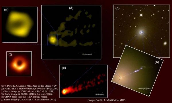 据了解,与此前“事件视界望远镜”合作组织拍摄的照片不同的是,之前的是黑洞的“特写”,人们能够看到的是亮环围绕着中间的黑洞阴影。而这次拍摄到的则是“全景”,在这张照片中有黑洞、黑洞周围的吸积流以及从吸积盘附近延伸向远处的喷流。作为事件视界望远镜黑洞照片的拓展,充分展现了黑洞和它周围环境的关系。