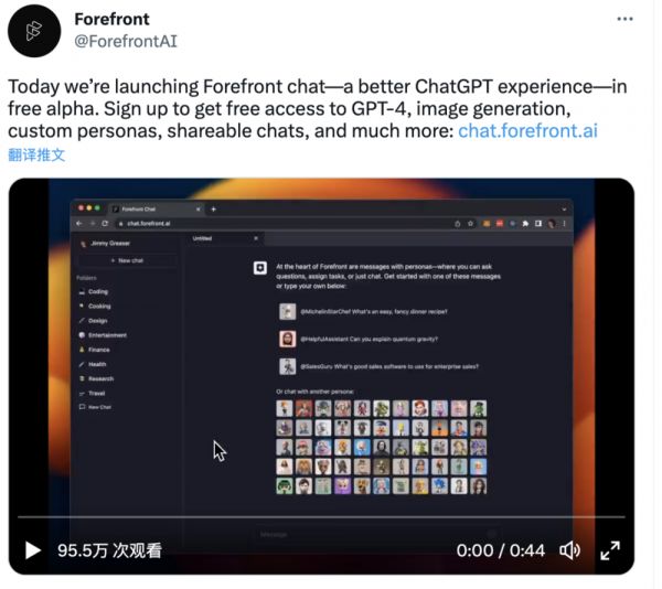 Forefront AI 在 Twitter 上表示:“今天,我们发布了 Forefront Chat 的免费 alpha 版,希望带来更出色的 ChatGPT 体验。注册即可免费访问 GPT-4、图像生成、定制角色、共享聊天等功能。”这也是目前为数不多的免费提供 GPT-4 模型的平台之一。