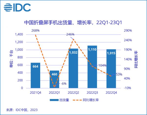 2023 年第一季度,中国折叠屏产品出货量保持稳定,达到 102 万台,同比增长 52.8%。其中竖折产品份额继续上升至 44.3%。随着更多厂商的加入和更多产品的发布,预计 2023 年中国折叠屏手机市场依然会保持快速增长。