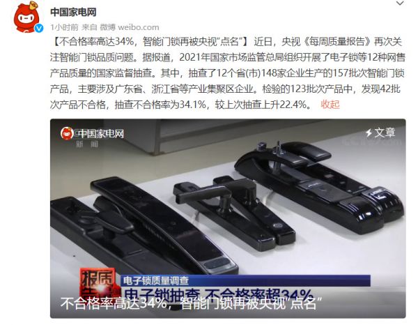 2018年,国家质检中心抽检了40款智能门锁,其中6款被小黑盒秒破解,剩余产品也存在其他安全风险。2019年,京津冀三地消费者对28家品牌的38款产品进行抽检,结果发现均存在不合格的地方。2021年国家市场监管局又对157批次产品进行抽检,不合格率高达34.1%。智能门锁作为守护家庭安全的第一道关卡,不合格率却这么高,用户花几千块到底买了什么?