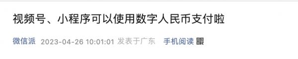 4月26日,微信官方公众号“微信派”发文,视频号、小程序可以使用数字人民币支付。