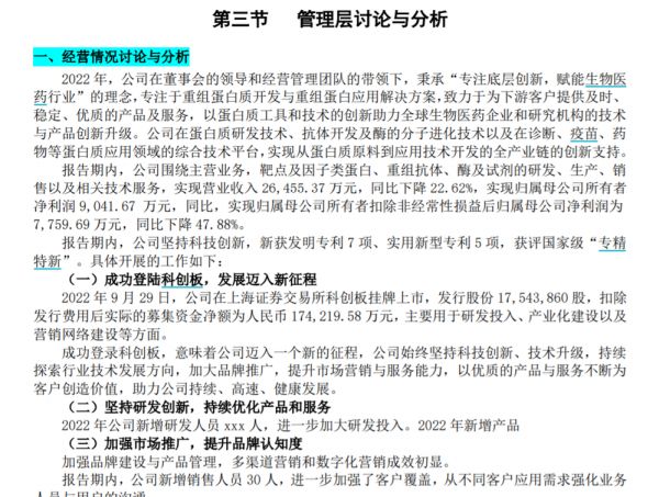 如年报第10页,管理层讨论与分析这一章节中,就出现了“公司新增研发人员XXX人”的数据缺失,写到“2022年新增产品”便戛然而止、再无下文。