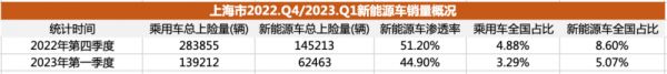 新能源车占比下滑的同时,上海在一季度整体乘用车也下滑明显,从去年四季度的28.4万辆骤跌至13.9万辆,抛开整体车市的涨跌,上海市今年一季度在全国市场中的占比,也从去年的4.88%萎缩到了3.29%。