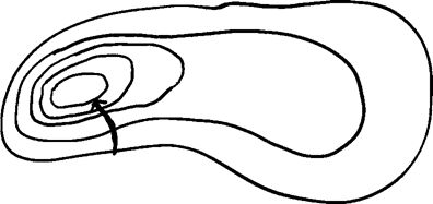 图1 这又是一个很棒的几何图形。当你利用梯度下降法来指引方向时,你在地形图上的路线必定与等高线垂直。