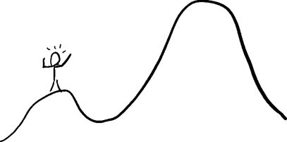 但事实并非如此。真正的峰顶还很遥远,而梯度下降法不能帮你到达那里。你掉进了数学家所说的“局部最优值”(local optimum,局部极大值或局部极小值,它取决于你的目标是冲顶还是触底)陷阱,在这个位置上,任何小变化都不能产生改善效果,但它远非真正的最佳站位。