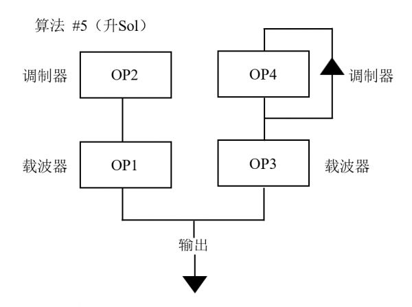 每个“OP”盒子代表一个合成器波,你可以通过转动盒子上的旋钮,让声音变得更响亮、更柔和、随时间淡出或淡入,等等。这些都稀松平常,而DX21真正神奇的地方在于它和操作者之间的连接。图 5 展示了一个鲁布·戈德堡机械式的过程,从OP1发出的合成器波不仅取决于这个盒子上你可以转动的那些旋钮,还取决于OP2的输出。合成器波甚至可以自行调节,附属于OP4的“反馈”箭头代表的就是这种功能。通过转动每个盒子上的几个旋钮,你可以获得范围极其广泛的输出。这给了我尝试的机会,自己动手制作新的音色。