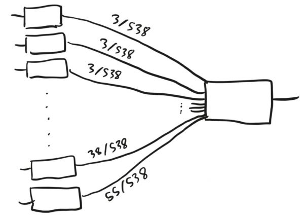 该神经网络的第一层有51个盒子,它们都向第二层的那个盒子输入数字。但箭头上的权重不同,最小的权重为3/538,最大的权重为55/538。这台机器在做什么?它将51个不同的数字作为输入,并激活每个输入大于0.5的盒子。然后,它对这些盒子进行加权计算,检验它们的和是否大于0.5。如果是,就输出1;如果不是,则输出 0。