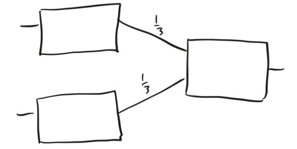 2. 一个输入不小于 0.5,另一个输入小于 0.5。那么,两个输出分别是 1 和 0,所以第二层的盒子接收到 1/3 作为输入,并输出 0。
