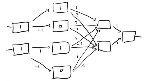 我们来试试这个装置(见图9)。假设我先向最左边一层的两个盒子分别输入1和1。这两个数字都是正数,所以第一层的两个盒子都会输出1。再来看第二层,第一个盒子接收到的数字是1×1 = 1,第二个盒子接收到的数字是-1×1 = -1。同理,第二层的第三个盒子和第四个盒子接收到的数字分别是1和-1。1是正数,所以第一个盒子输出1。但第二个盒子接收到的输入是一个负数,未能被触发,所以它输出0。同样地,第三个盒子输出1,第四个盒子输出0。