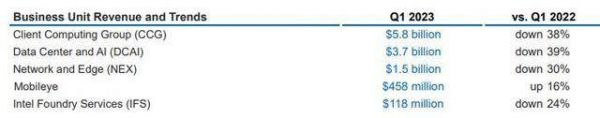 分业务来看,包括个人电脑芯片在内的英特尔客户端计算事业部(CCG)一季度营收58亿美元,同比下跌38%,环比下跌12%,延续了去年四季度同比暴跌36%的颓势,高于预期的49亿美元。
