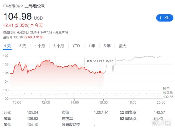截至美东时间4月26日收盘,亚马逊股价为104.98美元,上升2.41%,总市值为10800亿美元。此外,亚马逊将于28日凌晨公布2023年第一季度财报。