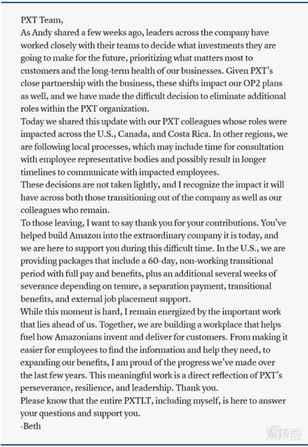 虽然这一刻很艰难,但我仍然对我们面前的重要工作充满信息。我们正在共同建立一个工作场所,帮助推动亚马逊人如何为客户创造和交付。从让员工更容易找到他们需要的信息和帮助,到扩大我们的福利,我为我们在过去几年中取得的进展感到自豪。这项有意义的工作直接反映了PXT的毅力,韧性和领导力。谢谢。
