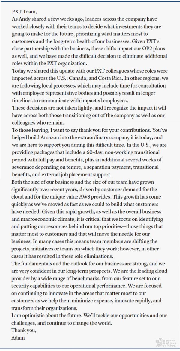 近年来,由于客户对云和AWS提供的独特价值的需求,我们的业务规模和团队规模都大幅增长。这种增长速度非常快,因为我们需要尽可能快地给出客户需要的东西。鉴于这种快速增长、整体业务和宏观经济环境,我们必须将我们的资源用于首要任务,比如那些对客户而言最重要的事情上,这将推动我们的业务。在许多情况下,这意味着团队成员正在转移他们工作的项目、计划或团队;然而,在其他情况下,这可能导致我们不得不裁掉一部分的员工。