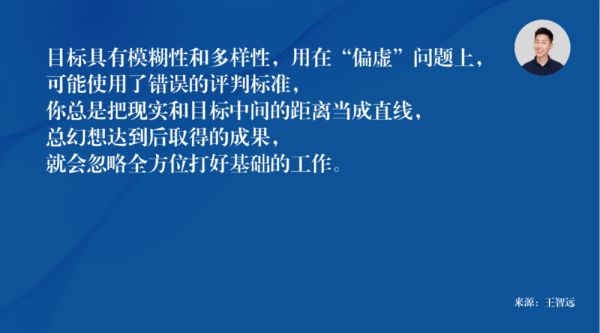 目标通常具有模糊性和多样性,用在“偏虚”问题上,可能使用了错误的评判标准,因为你总是把现实和目标中间的距离当成直线,总是在幻想,达到后取得的成果,而忽略了全方位打好基础的工作。