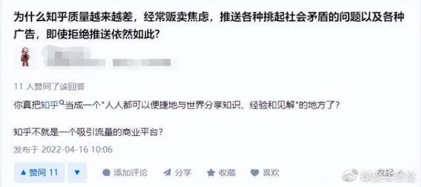 在知乎上曾有这样一个问题:“为什么知乎质量越来越差,经常贩卖焦虑,推送各种挑起社会矛盾的问题以及各种广告,即使拒绝推送依然如此?”