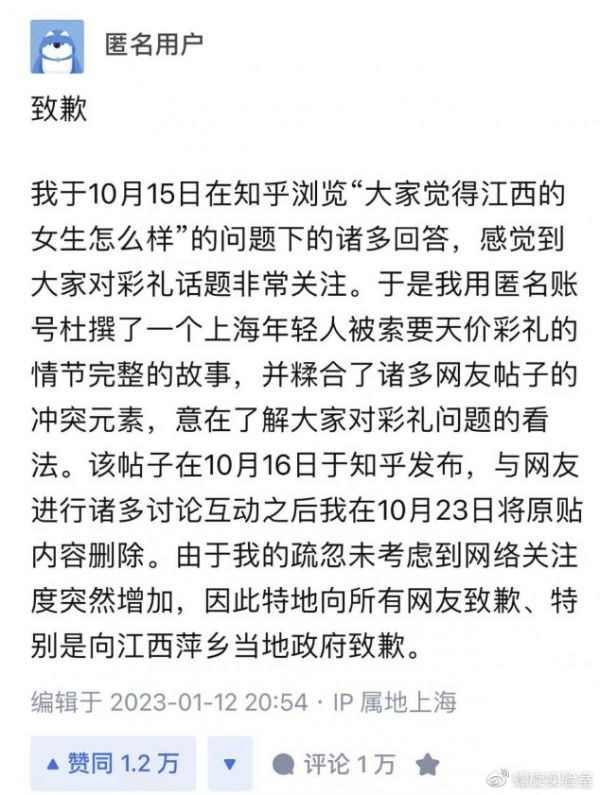 但后经查实,该内容系凭空虚构,知乎宣布将永久封禁原作者账号。