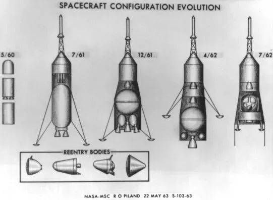 从1959年到1962年,3年的论证,终于确定了阿波罗飞船任务的细节。在这张飞船构型与布置的变迁图中,可以看到飞船系统前期论证是如何地一波三折。